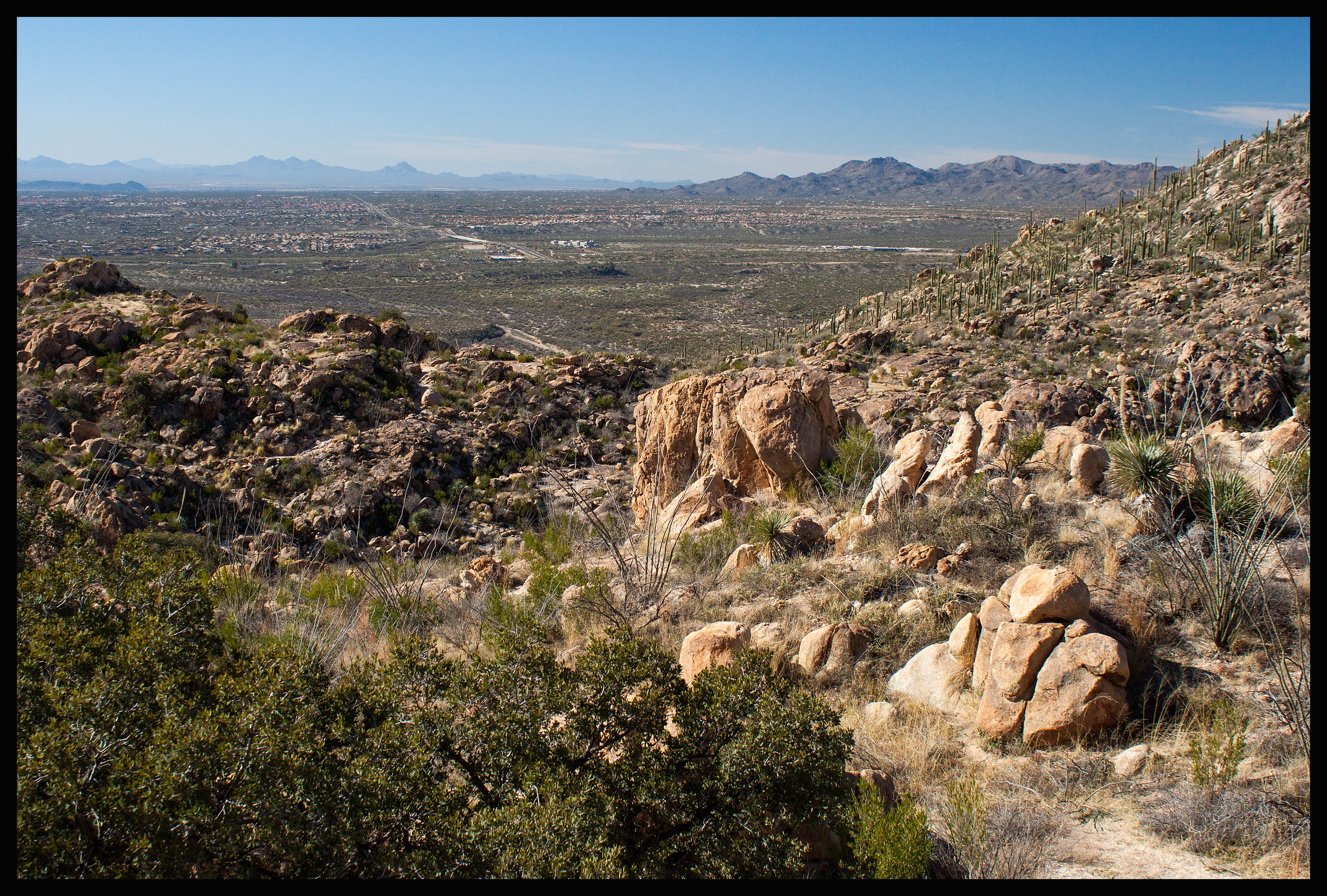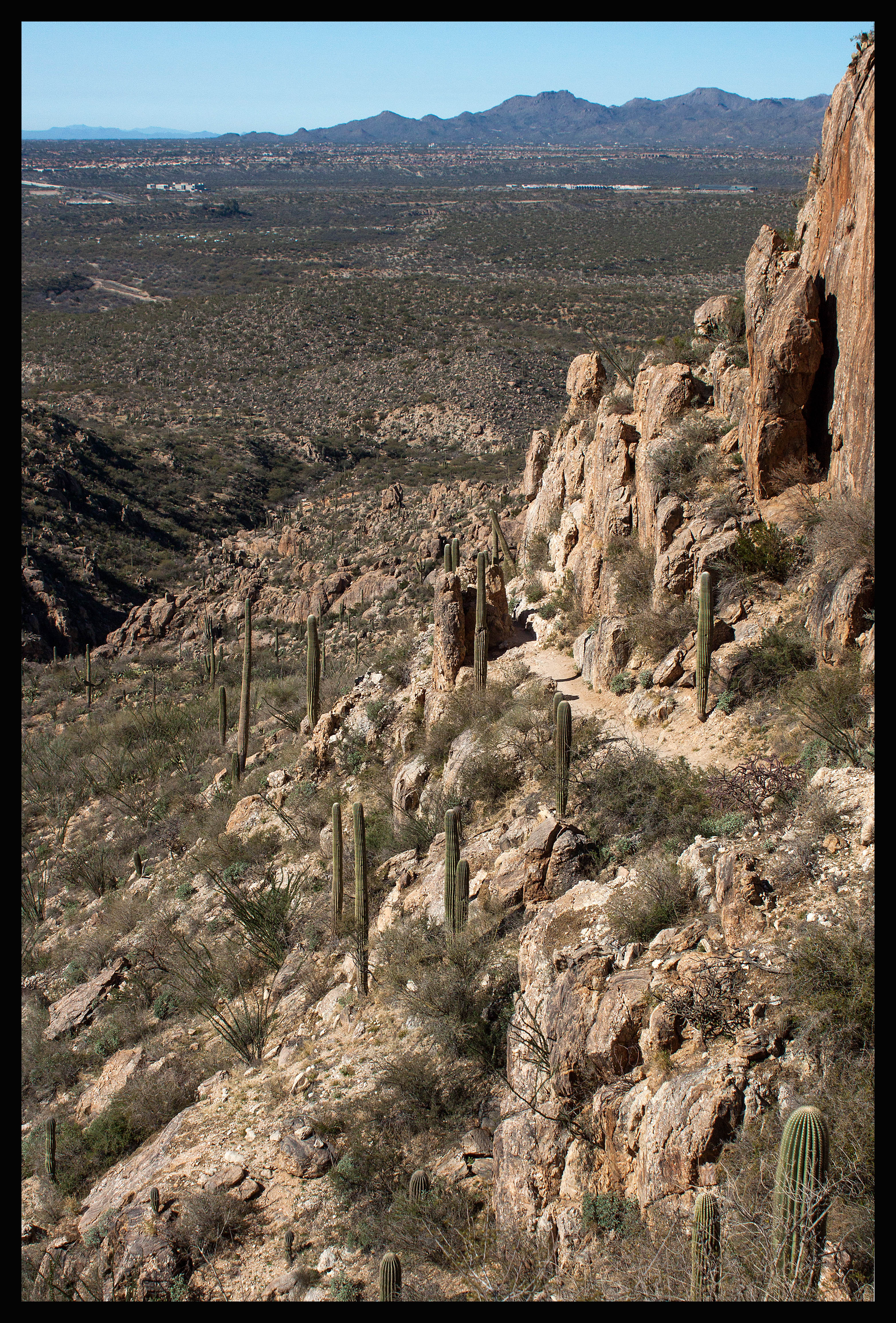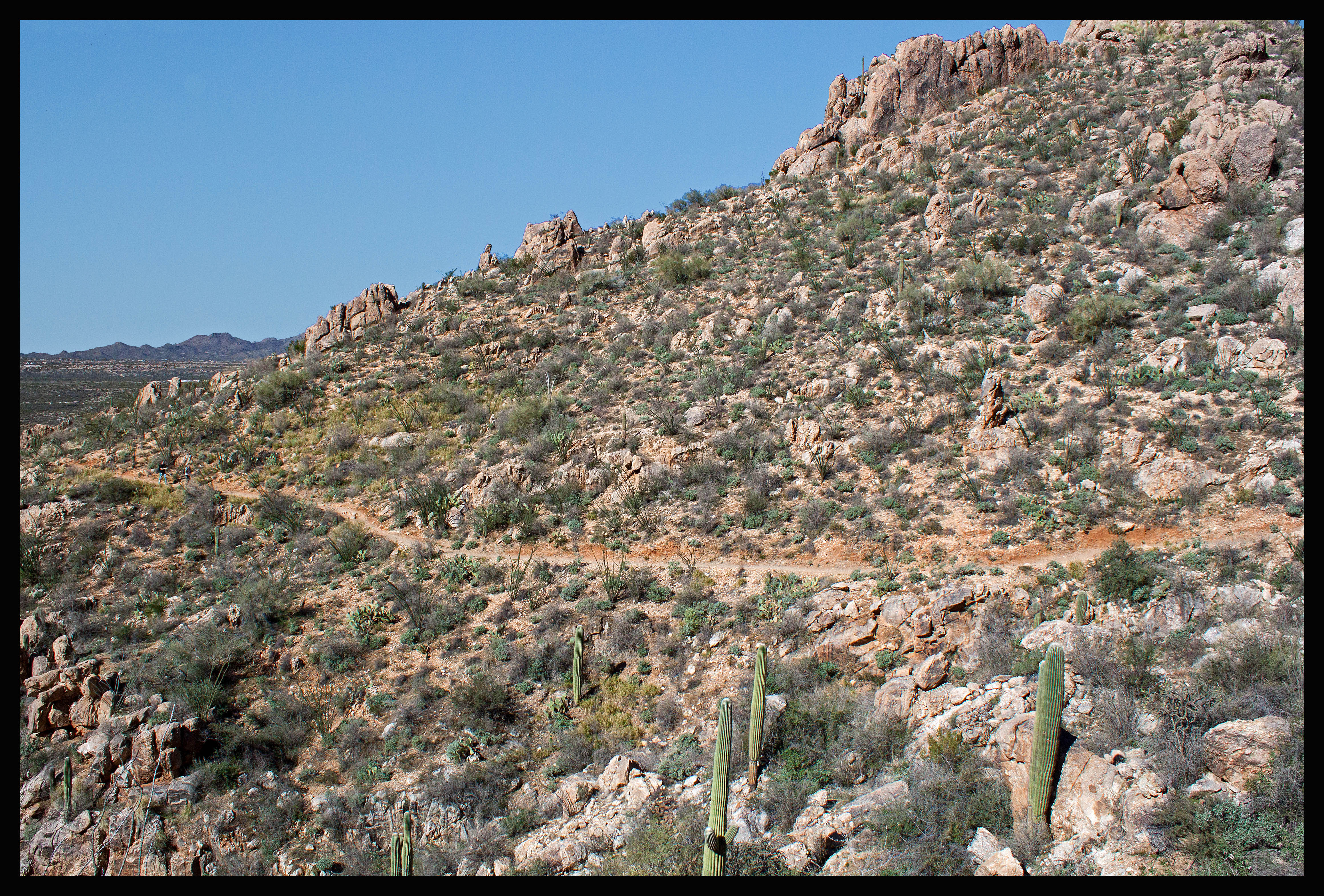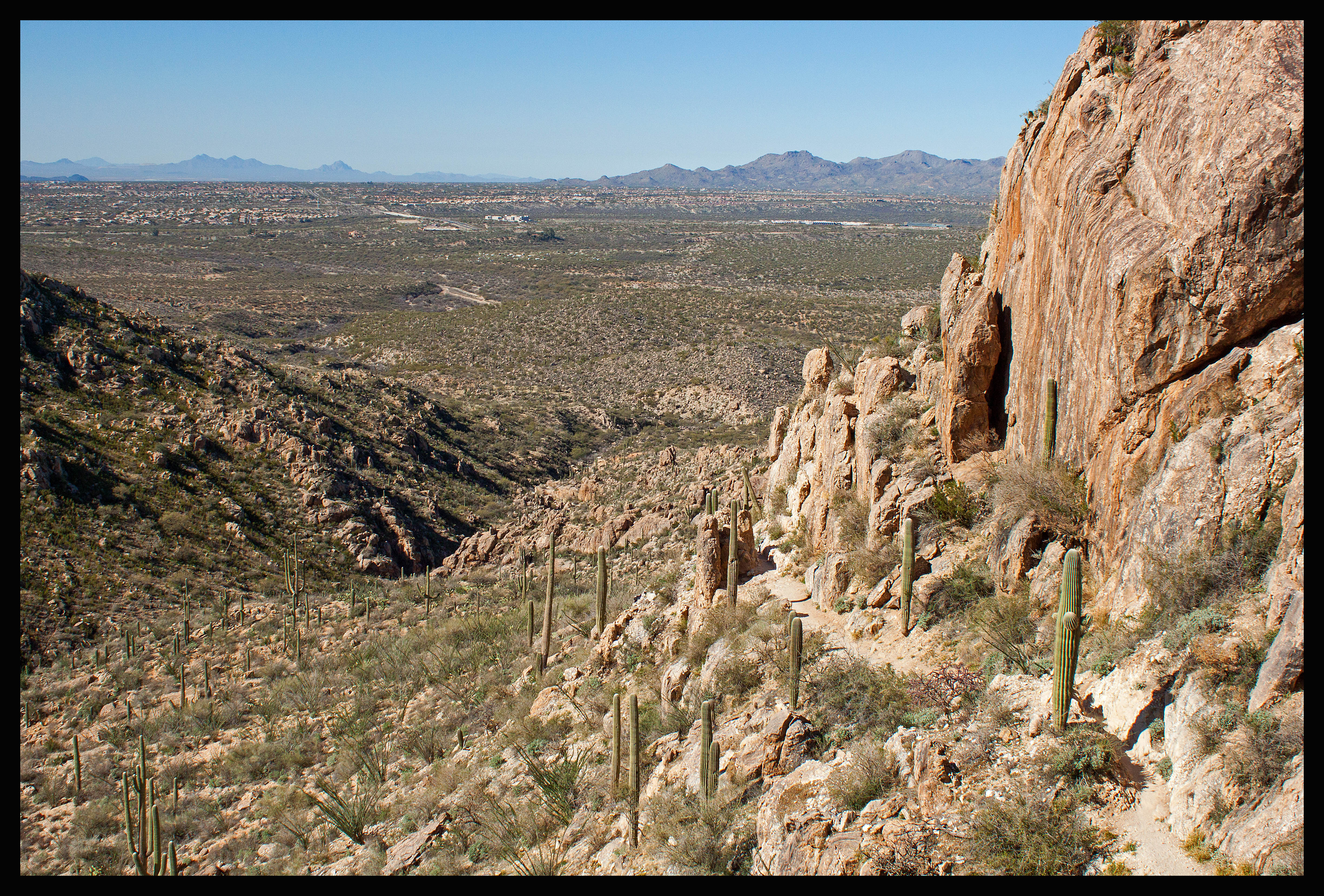 The hike to Romero Pools is 5.6 miles roundtrip and offers beautiful views of Tucson and the surrounding land. It also leads to running water, which is a rare treat in southern Arizona. The elevation gain is 1000 feet, but it occurs within a short portion of the hike before descending into the canyon.