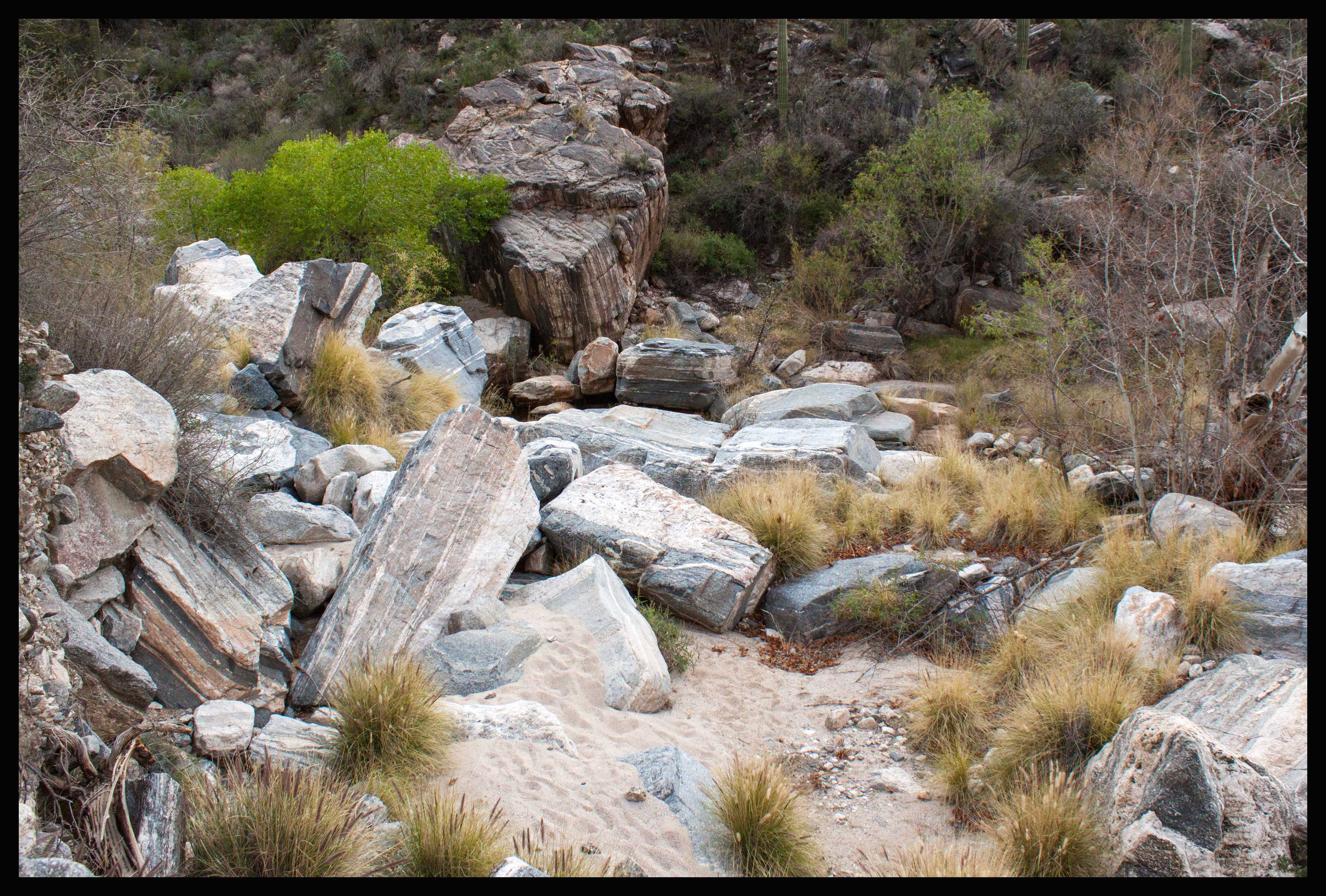 The first time I hiked Bear Canyon was in August, so it was oppressively hot, muggy and a monsoon storm had just hit the day before. With more rain than Tucson knew how to handle, we actually had to take our shoes off and wade across the bridge seen below, as the river was completely flooded. Even standing on the bridge, it was almost up to our knees.