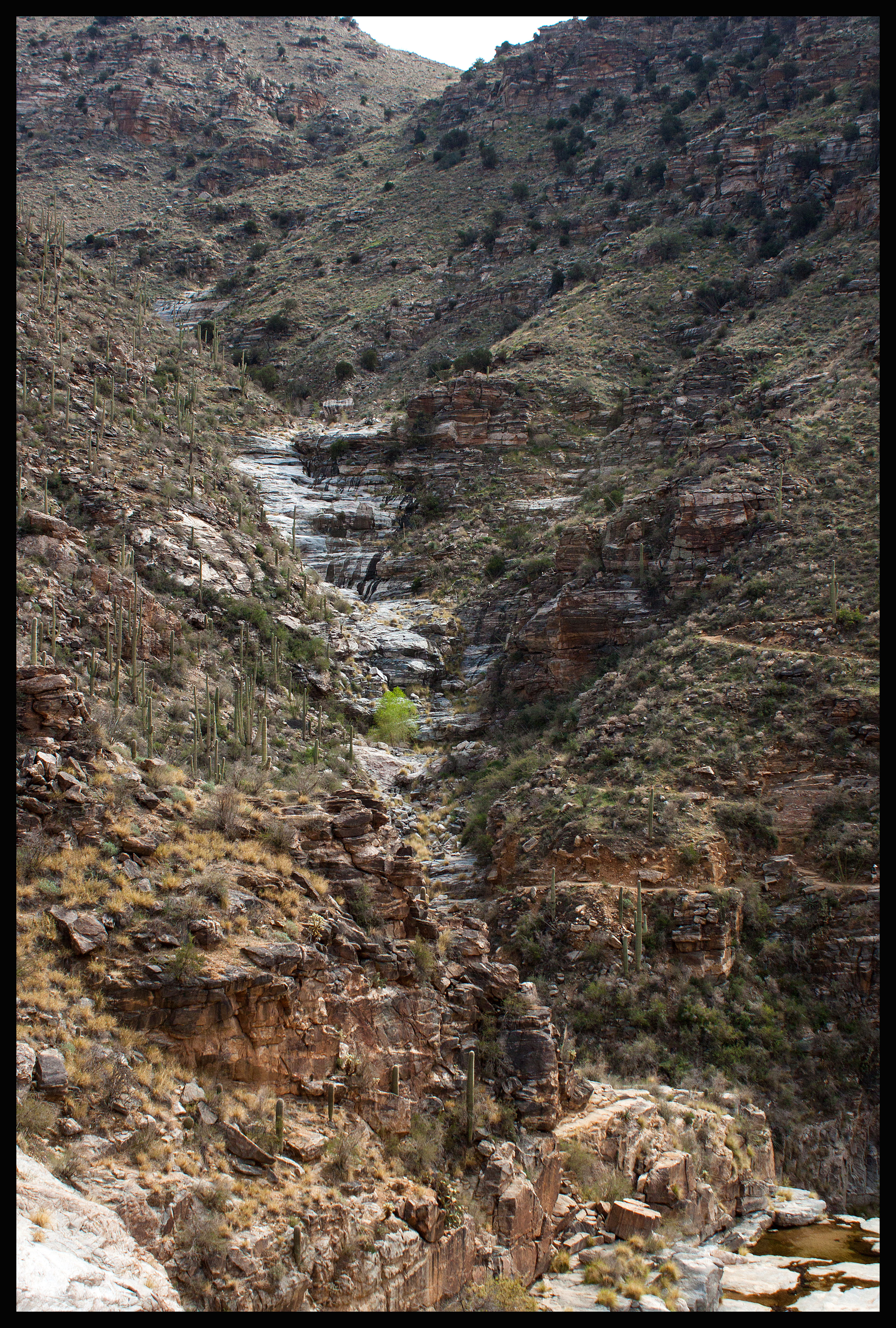 Parking at the recreation area costs $5, and provides access to three main trails (map), a tram line, and several shorter trails. The trail through Bear Canyon to Seven Falls is about 8 miles roundtrip, or 4 miles roundtrip if you pay to take the park tram to the trailhead. Otherwise, you have to walk two miles through the park to reach the canyon start. NOTE: This trail has got to be one of the most popular hikes in Tucson. It is very rare to be completely out of sight of other hikers if you do this trail anytime after 8:00am.