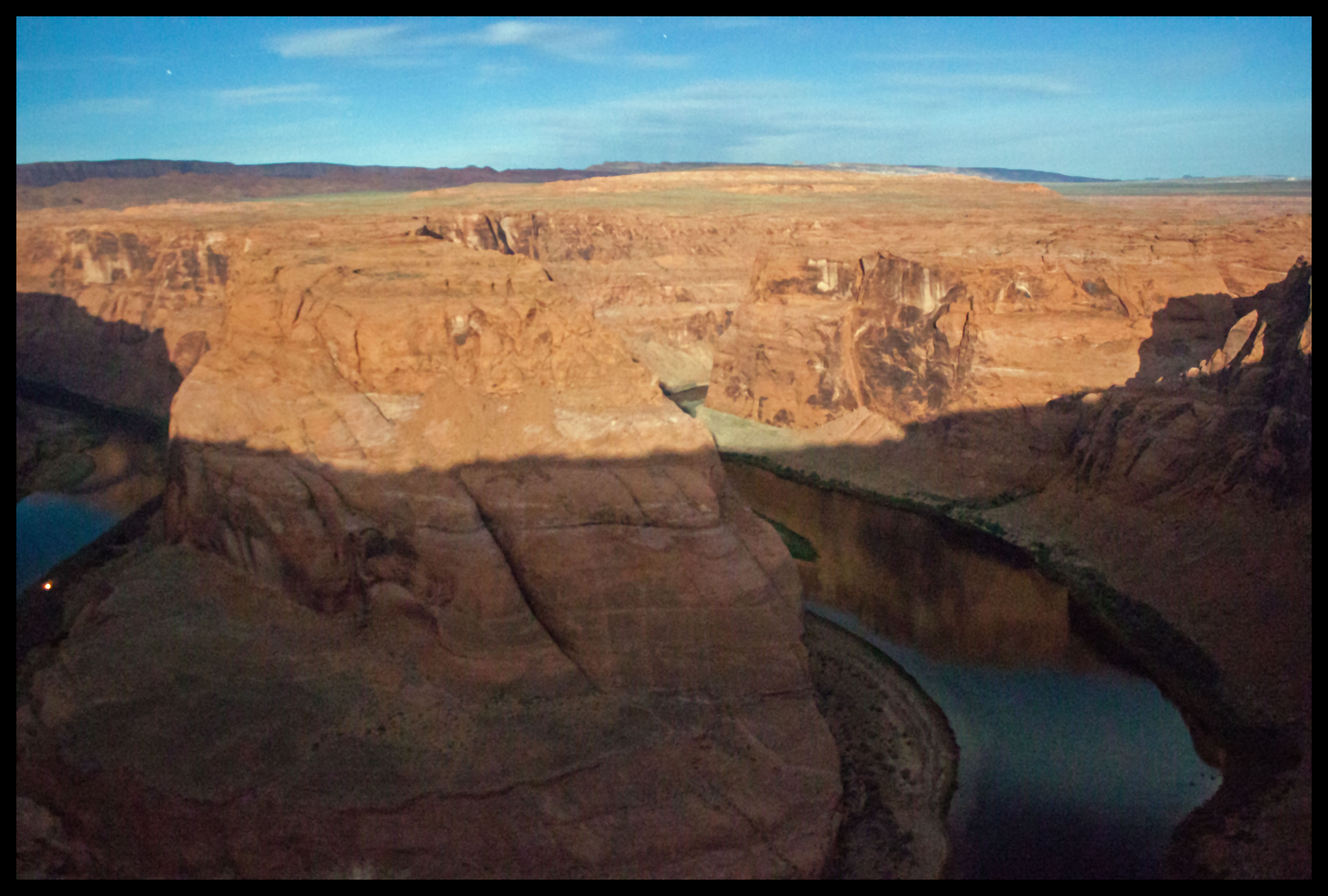 Horseshoe Bend by moonlight. To the left, along the river, you can see one of the campsites.
