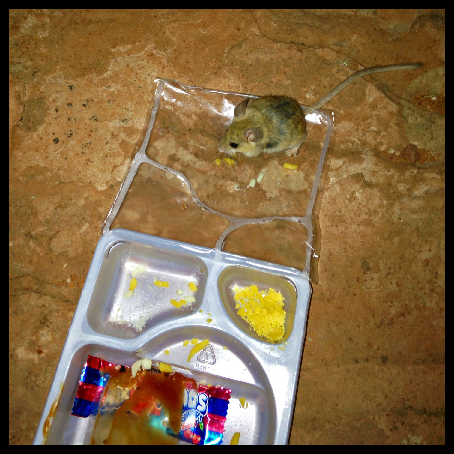 Only visible by a camera flash, several mice came out to sneak some food from us once it got dark.