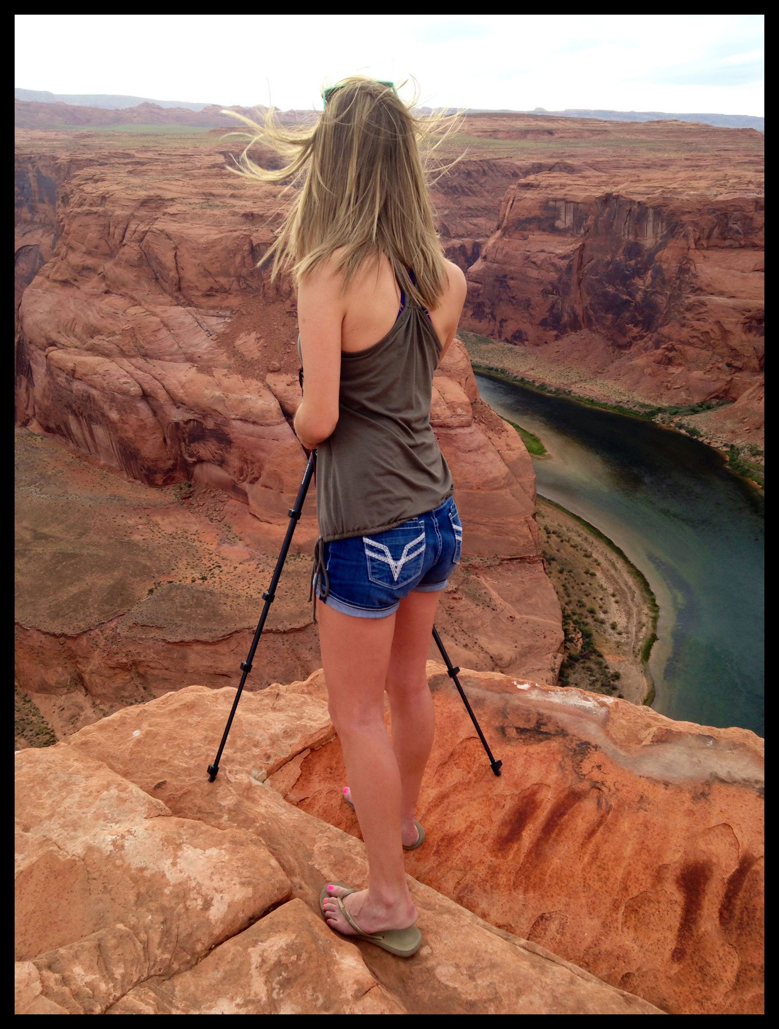 The hike to Horseshoe Bend is about 3/4 of a mile from the parking lot. It goes up a short, steep hill before gradually descending to the overlook. In our rush to get out the door, I forgot to grab my sneakers and had to do it in flip flops. Since it was a combination of sand and rock, I did most of it barefoot, but you’d be better off just not forgetting your sneakers in the first place.