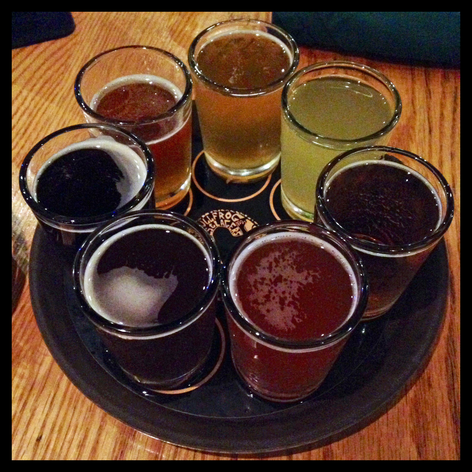 Since we were celebrating Kim’s birthday we wanted to find a restaurant that was at least somewhat ‘happening,’ we settled on a place called Bullfrog Brewery. I haven’t spent much time in Williamsport, but my impression from a few drive-throughs is that it’s a fairly large city with not much going on. The brewery was very crowded and had live music playing, so we got lucky with that choice. We got a pretzel log appetizer (yummm), I had a burger, and we got a beer sampler, all brewed by the restaurant. In fact, because I’m writing this so late, I’ve already been home for Thanksgiving and Christmas since this night. On my drive back from Christmas I stopped here for dinner and had another delicious burger. Back in October my favorite two beers were the Mise en Garde and the Blackberry JuJu, but they had already changed selection by early January.