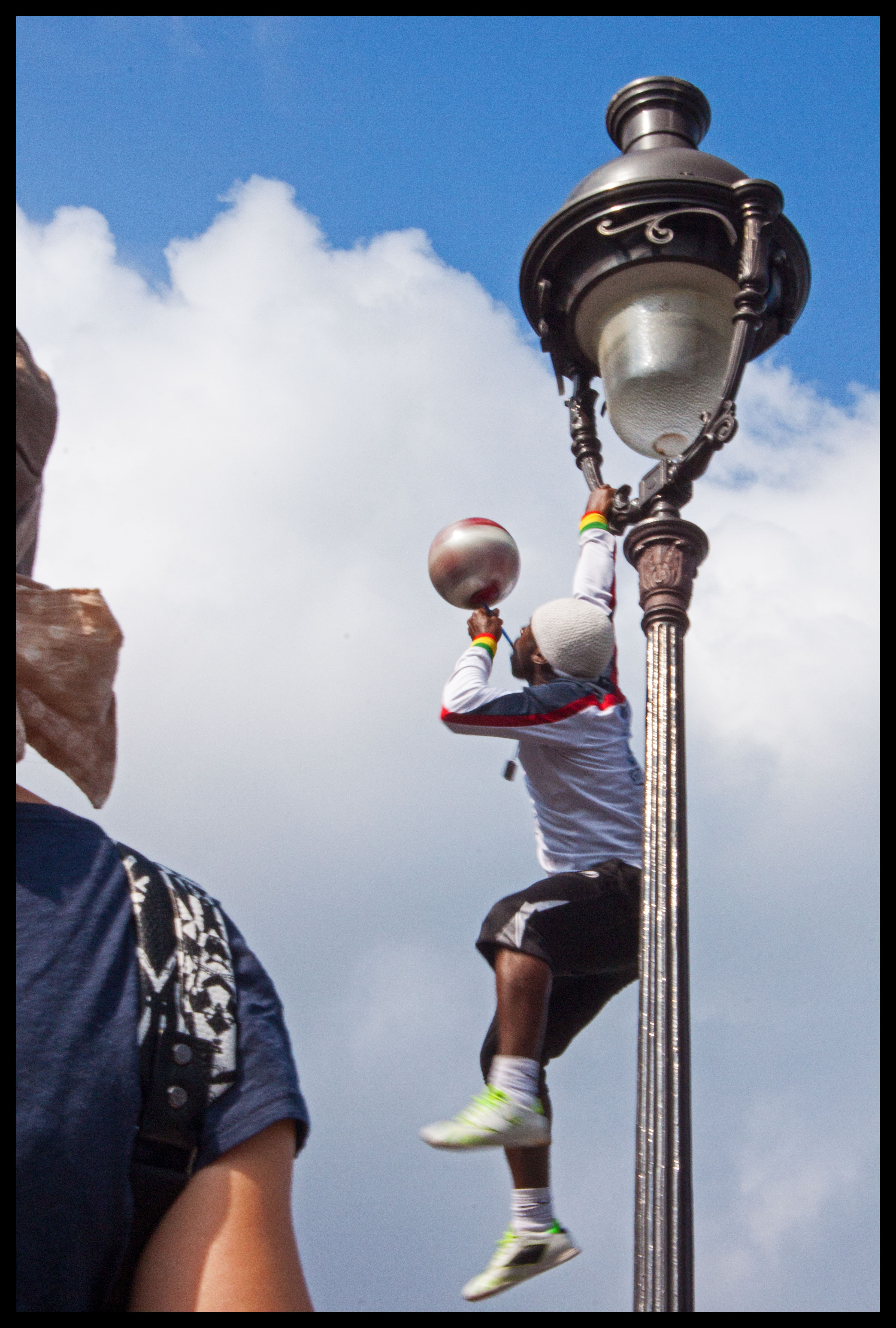 When we began to watch, he was still standing on the ground, doing typical tricks many people had seen before. Eventually though he began to climb the lamp post and continue amazing the crowd. when he finally dropped the ball, there were plenty of donations and tips waiting.
