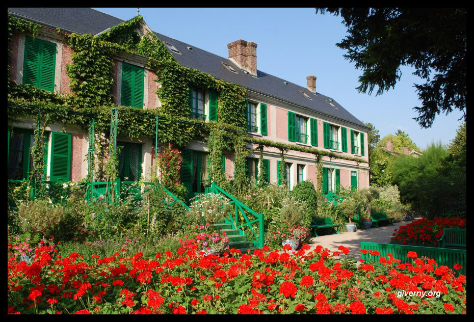 Monet’s home, on a much sunnier day than when we visited. (Image Credit: Ariane Cauderlier, http://giverny.org/gardens/fcm/visitgb.htm)