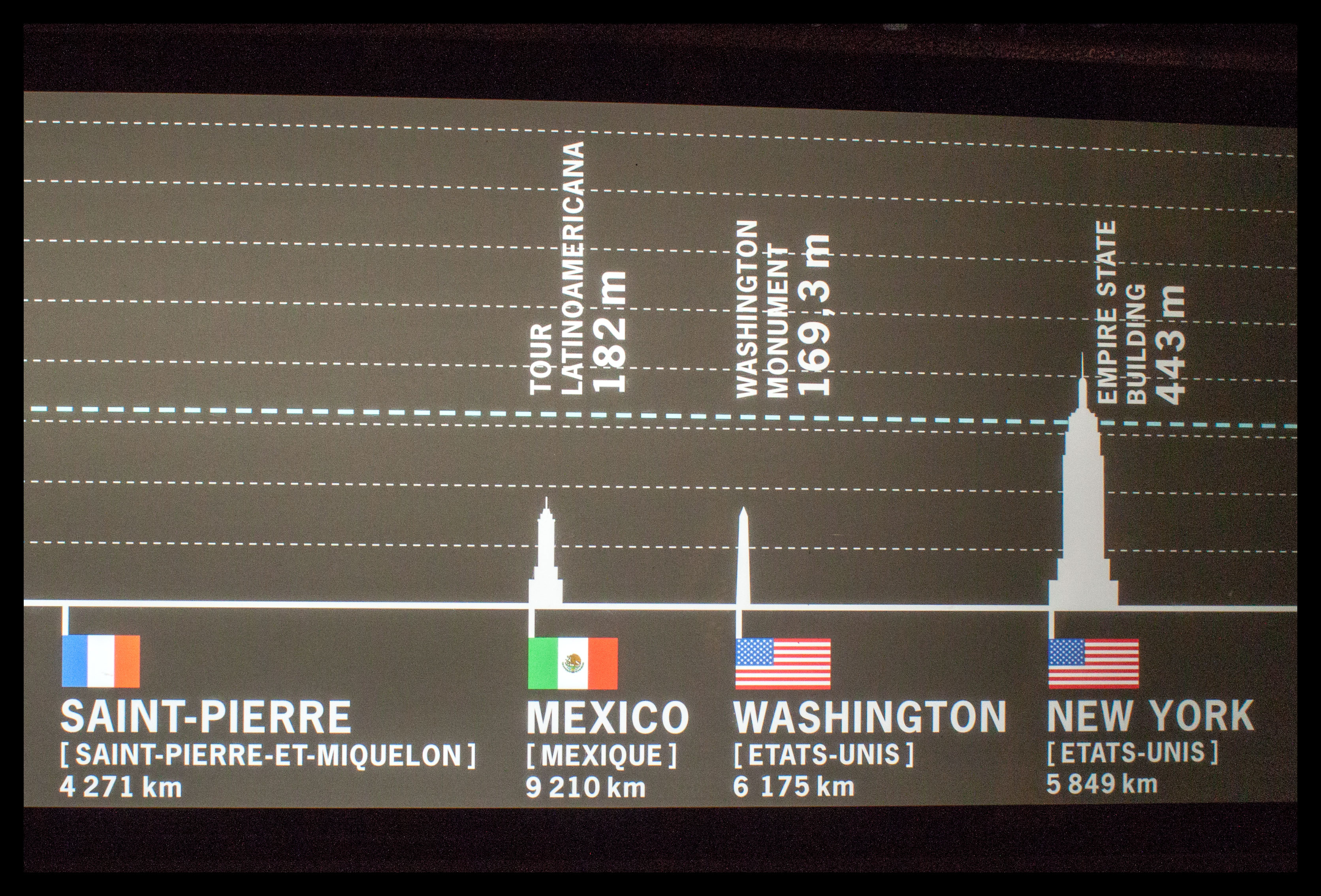After the second floor we took a smaller elevator to the third and final level. At the very top of the Tower you could purchase a 12€ ($15) glass of champagne if you were so inclined. We weren’t inclined, so instead busied ourselves with the wraparound display shown below. It showed almost all, if not every country’s tallest building to scale, comparing with the Eiffel Tower. The United States somehow got two comparisons of buildings; perhaps it’s assumed that most people who had visited the states were able to visit either the Washington Monument or the Empire State Building.
