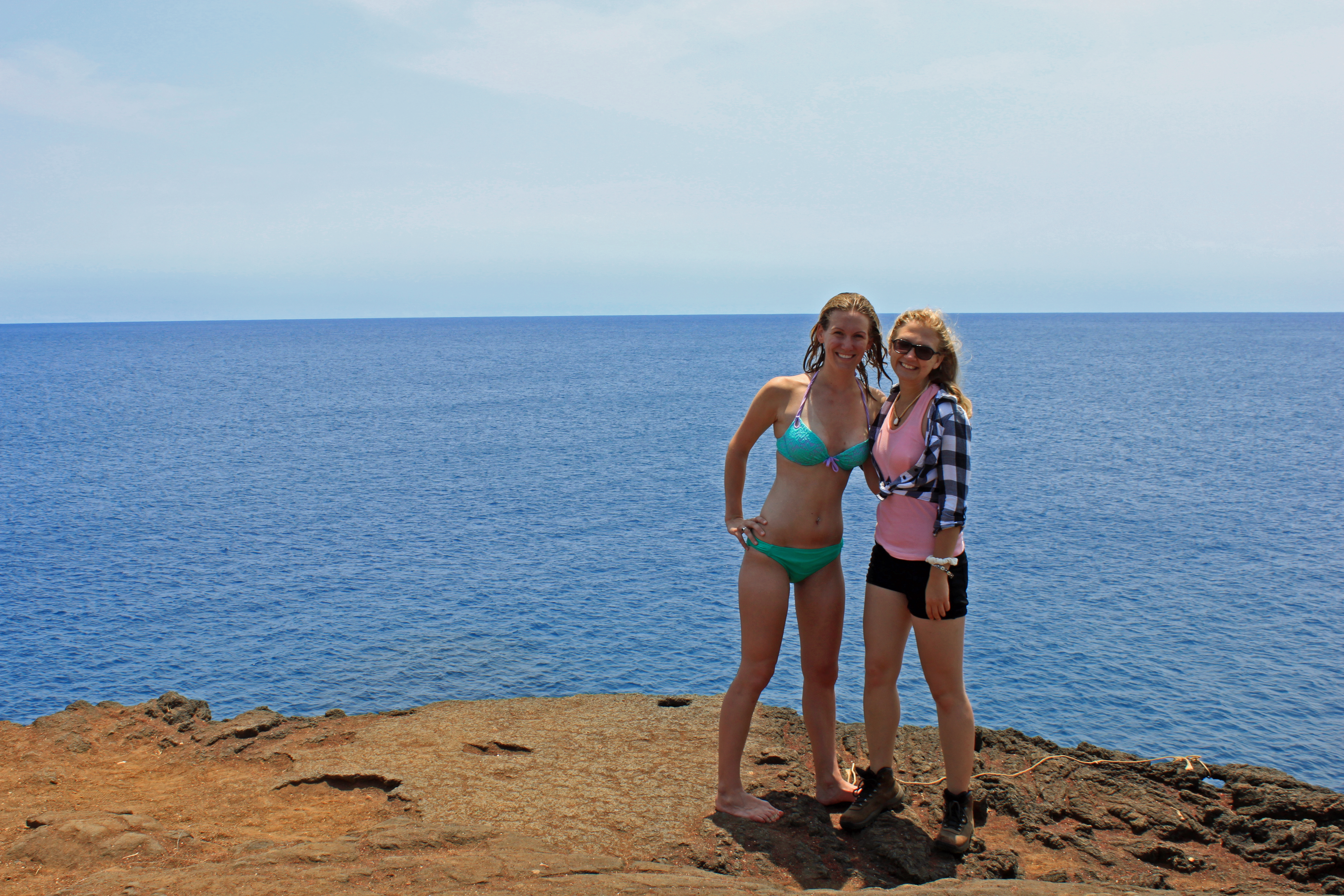 When you arrive to Ka Lae you’re only a few feet from the edge of a 45-foot cliff overlooking the ocean. This cliff makes the ultimate adventure for daredevils visiting Hawaii. When we arrived there were at least a dozen people throwing themselves off of this cliff repeatedly. (They probably call it diving; to me it looked like sheer lunacy.) Several people in our group wanted to jump but only one ended up actually doing it. Below is a picture of two of us standing mere feet away from the edge of the United States, with nothing behind us until Antarctica.