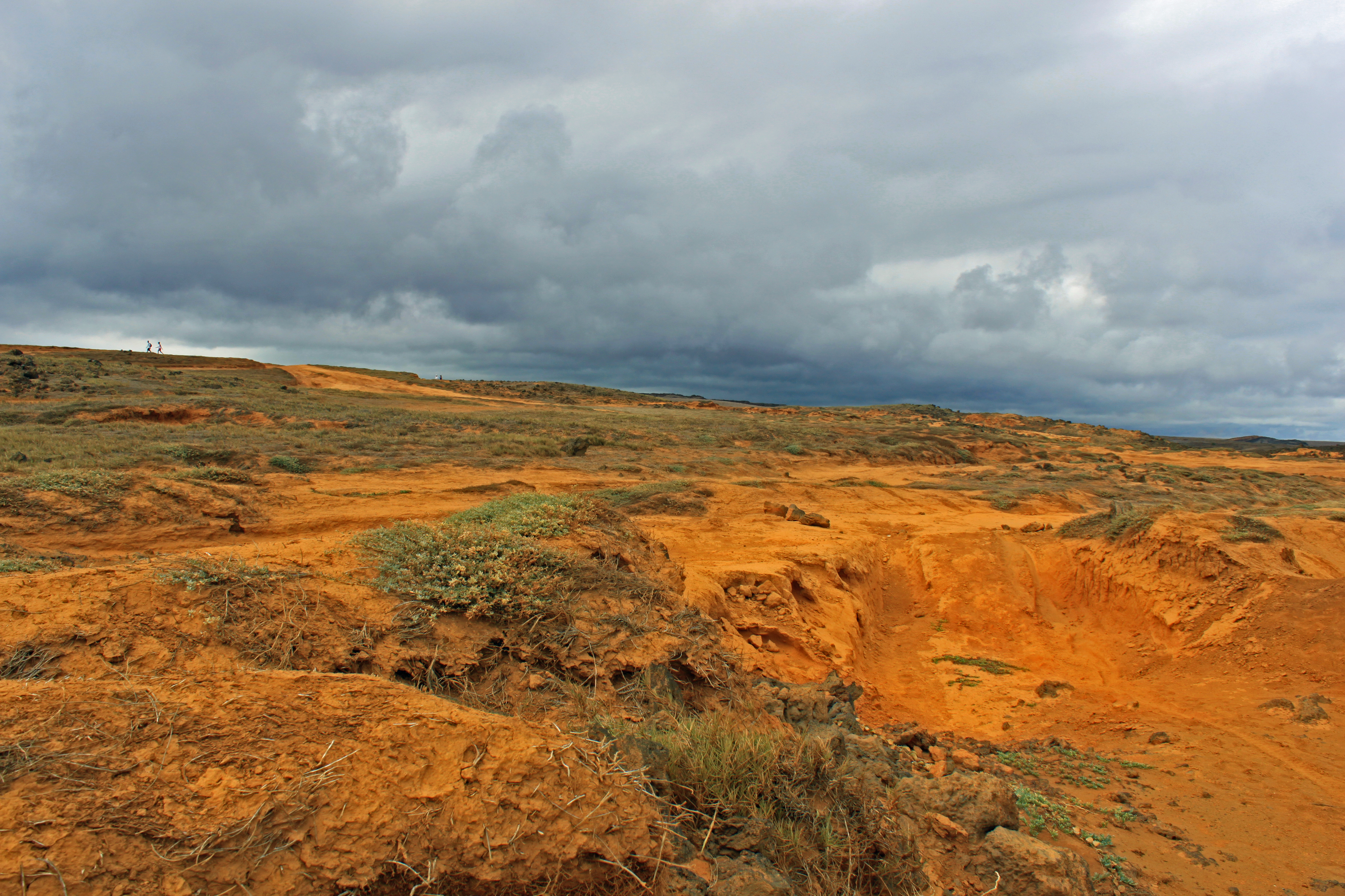 Once we arrived at the beach, we stopped briefly for a nice overlook and some severe disappointment. While I could sort of convince myself that the sand looked like a puke-green color, it mostly appeared to be a yellow-brown. We had a local with us, and he told us it would have looked greener on a non-cloudy day. We decided to enjoy it for then, but that we probably wouldn’t hike back. The picture below shows the view of the beach from the top viewpoint.