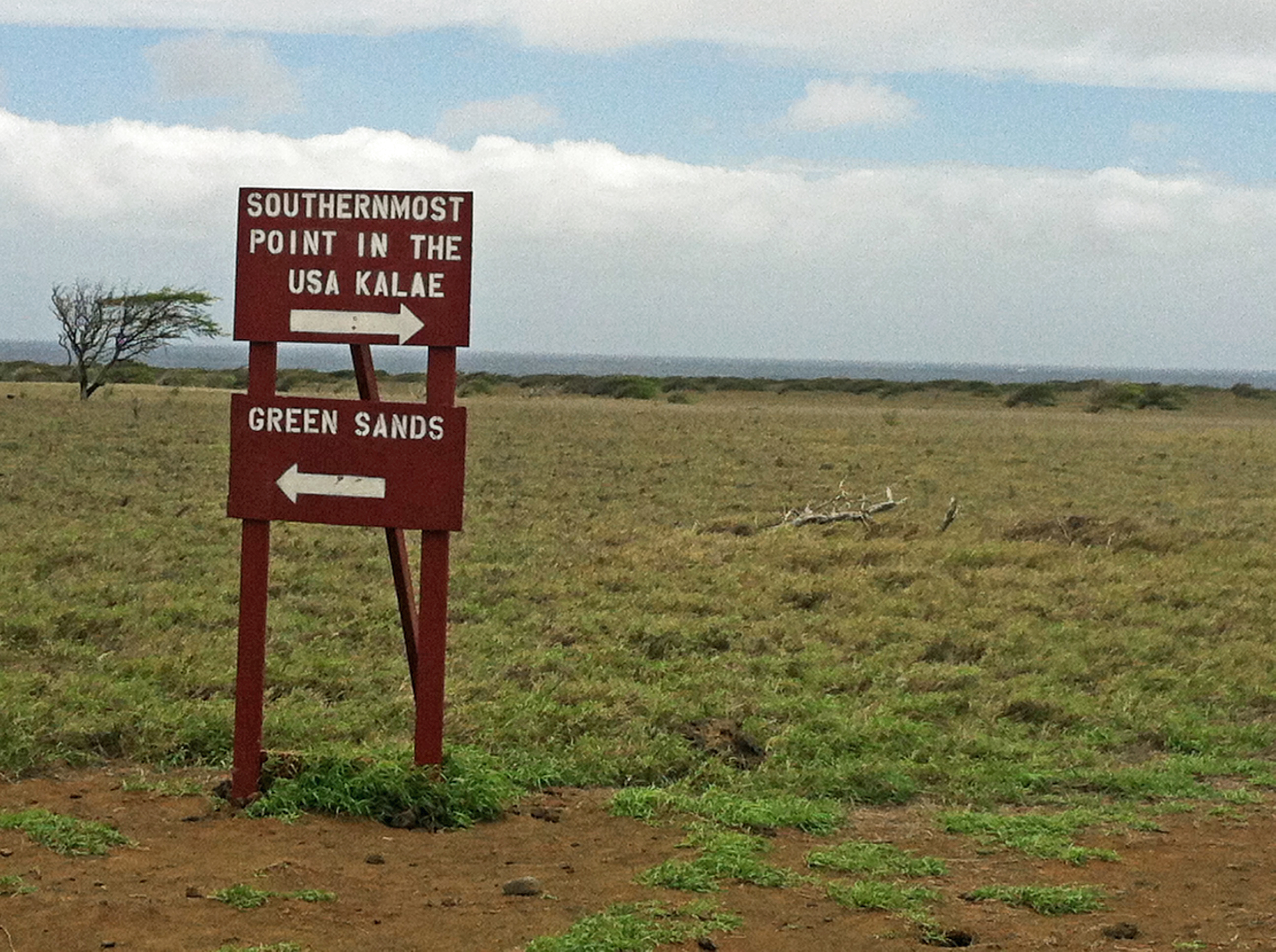 Several Saturdays ago, about ten other interns and I (from several different observatories) made the venture to Ka Lae, the southern most point of the United States, and to the green sands beach about to miles away. Papakōlea Beach is one of two green sands beaches in the world, the other being on the Galapagos Islands. This adventure checked off #32 (Ka’u: South by South). Ka’u is the district we were in, while Ka Lae is where we were visiting. Visiting the southernmost bakery of the United States is recommended, but we chose to visit the southernmost bar instead. Below is the usual map showing where we were in relation to Hilo and what route we took driving.
