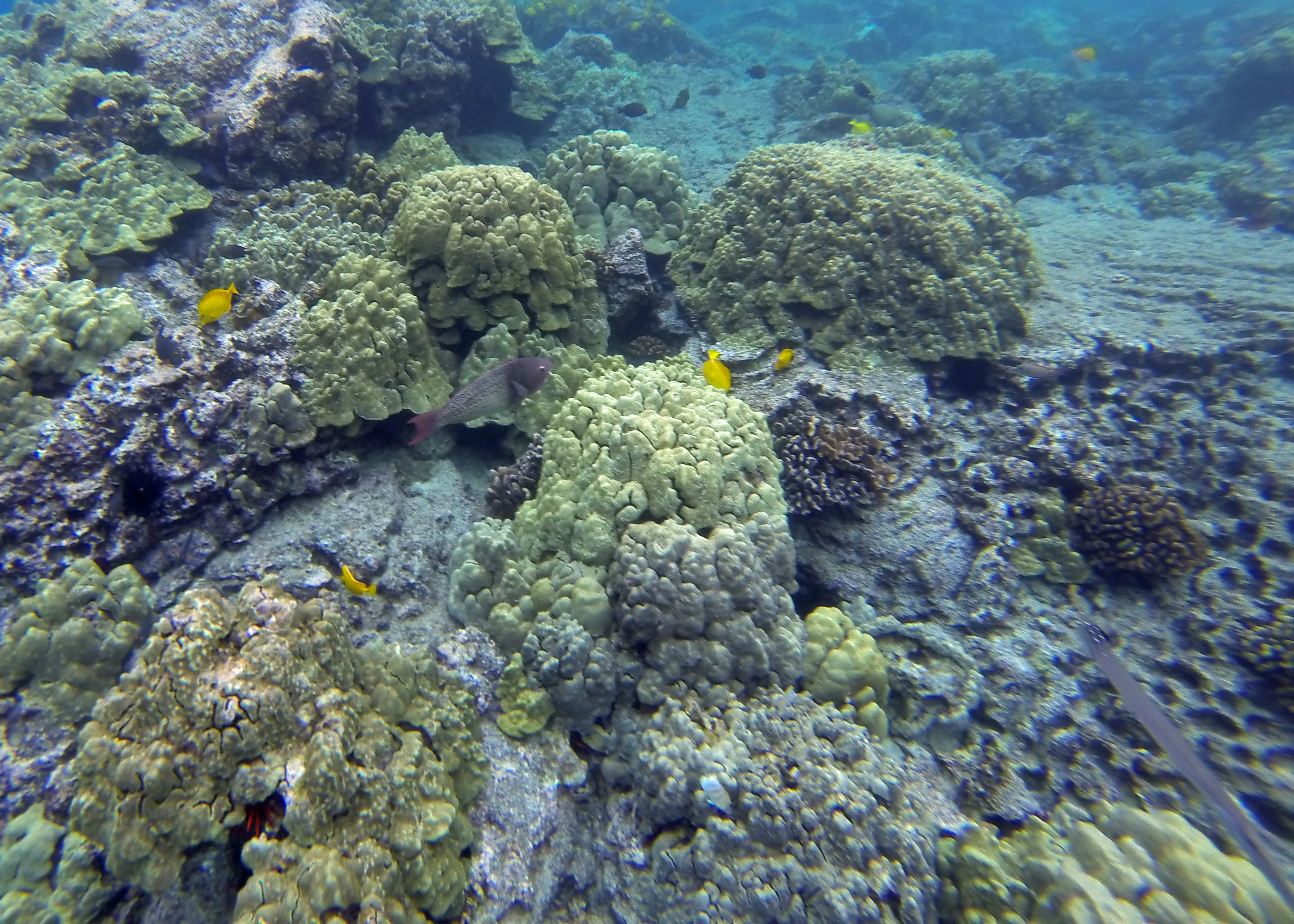 Honaunau Bay is also known as Two-Step, for the convenient rock ledge that forms two steps. At this point, you can jump into fairly deep water without worry about scraping any other rocks or coral. Elsewhere around the beach it is difficult to enter and exit the water. This bay is just south of Kealekekua and right next to Pu’uhonua O Honaunau National Historical Park (also known as Place of Refuge). The waters were crystal clear when we visited. Of the three snorkeling trips, this bay was probably the least protected from ocean waves, so the snorkeling was mildly rough at times. There was plenty of clear, deep water here, making this trip my second favorite. People park right outside of Puʻuhonua o Hōnaunau National Historical Park and walk about a block to reach the beach. This is very easy drive-up snorkeling.