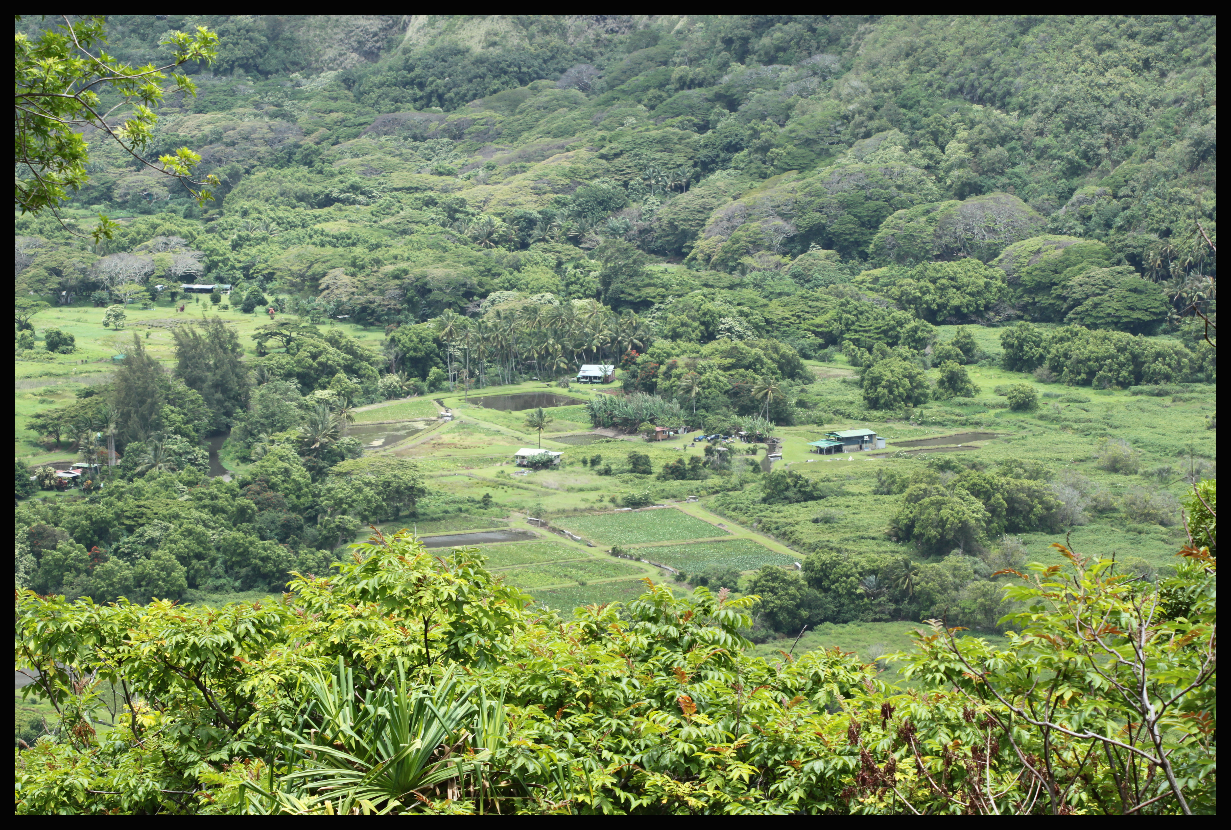 At Waipi’o Valley you are able to look down 2000 feet toward the ocean and to an extremely small town of Hawaiian residents that prefer an out-of-the-way, private lifestyle. By town I mean neighborhood, and by extremely small I mean the estimate I’ve heard is 60-70 people. That might be generous based on the part I walked through. Some readings will describe frequent property right conflicts down in the valley, or an unpleasant attitude toward tourists. For these reasons I personally made sure to abide by all of the “No Trespassing” signs and stay on the public main roads while I was exploring their land. The road into the valley is however classified as a public road, so walking down should not be an issue. The Waipi’o Valley overlook is a stopping point for many people. Parking is free, but the lot is mostly limited to about ten minutes with some half hour spaces. The overlook affords views seen below: