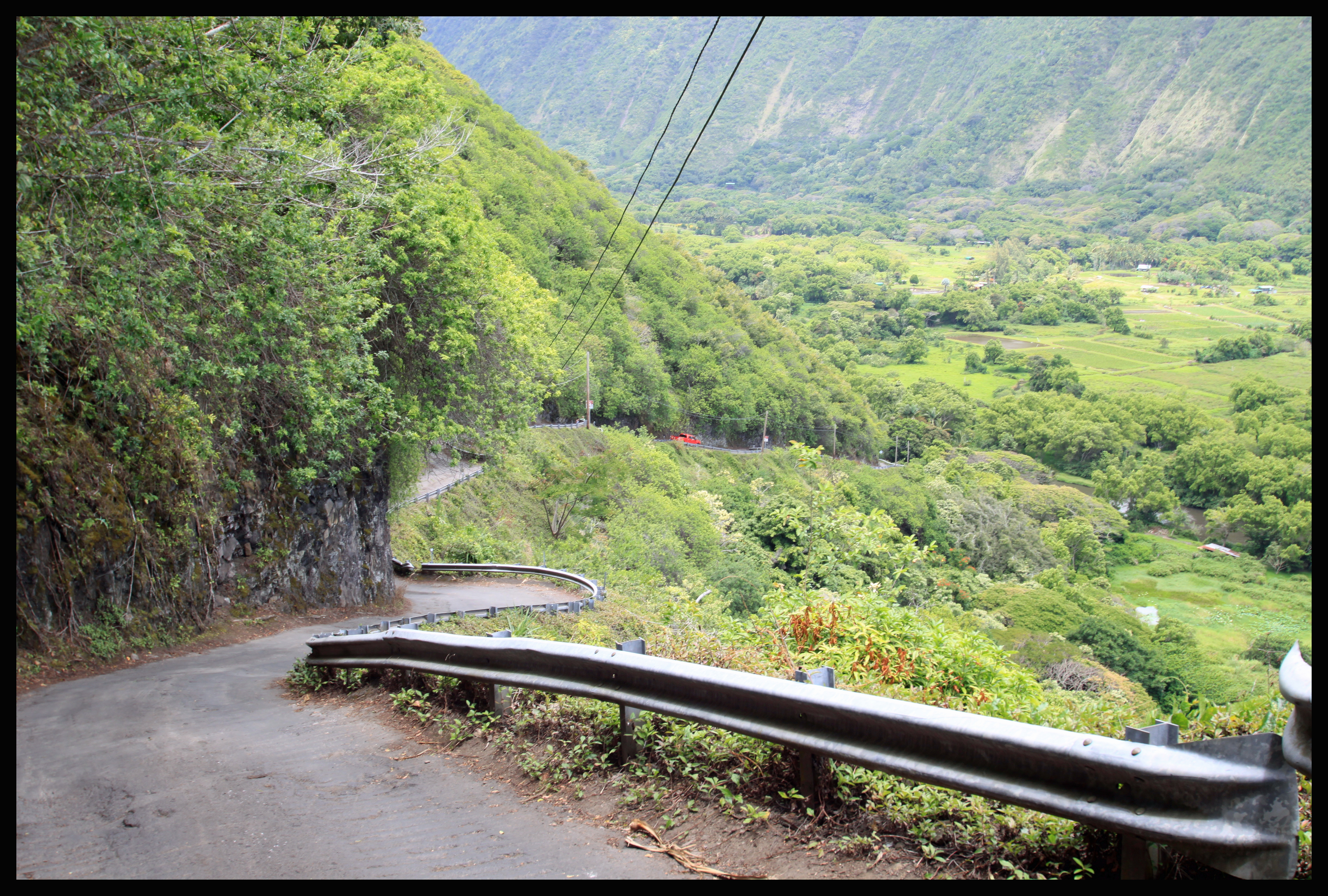 The first image is looking towards the right, and outside of the valley towards the ocean. The second image looks down into the valley towards the remaining settlement. There are still some taro farms down in the valley that can be seen in the second picture. Most tourists will walk down a steep path to the overlook, snap a few pictures, and continue on their journey. However, there are complete tours that go down into the valley. The catch here is that the road going into this valley is an impressive 25% AVERAGE grade, about a mile in length. According to Wikipedia, if this qualifies as a public road, it would be the steepest in the United States and perhaps even the world. While anyone can travel down this road, you MUST have four-wheel drive, which is why many people elect to take one of the tour options. The other option is to walk down into the valley, which is what I decided to do. I will say right off the bat – I am happy to say I did this hike, but I wouldn’t do it again. The road is hard on the knees going down, and exhausting on the way up. However, when you have four months here, you might as well experience everything to the fullest. I highly recommend bringing a small snack or lunch to enjoy while you rest at the bottom. You will have to walk along the main road and make sure to clear the way for any vehicles going up or down. In many places the road is only wide enough for one car. All the same, I saw many other people making the journey on foot. Although pictures don’t really do it justice, I’ve included one picture of the road below. Notice the red car off in the distance, looking like it’s at a 45-degree angle on the road.