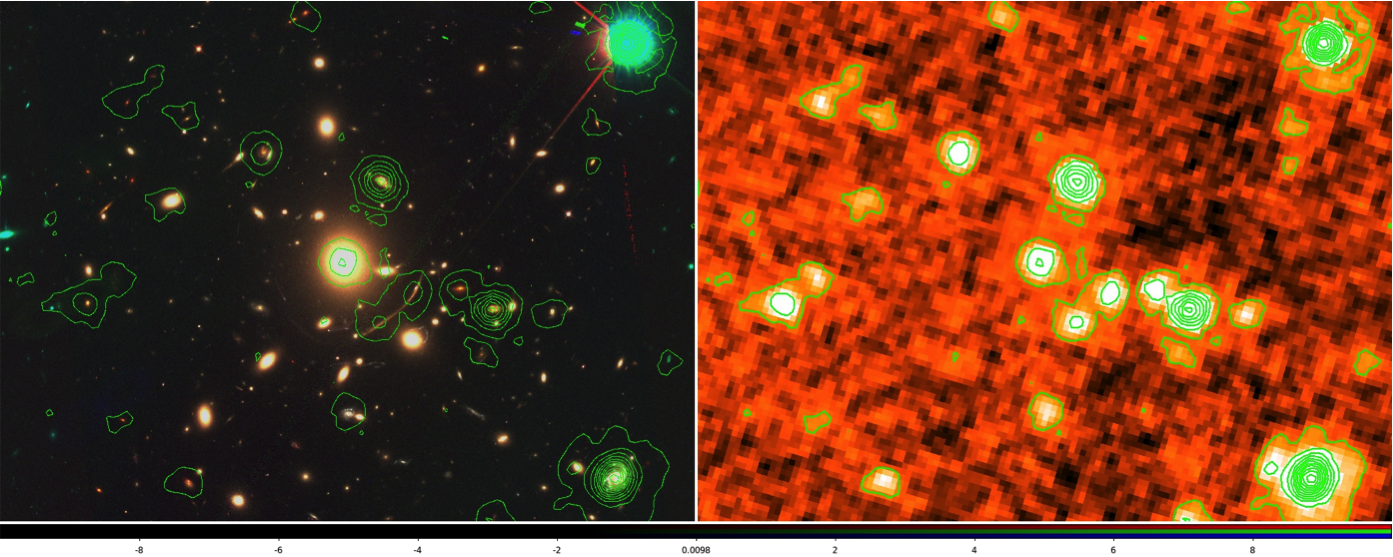 During my last year of college I was able to participate in a NASA Space Grant internship where I studied high redshift gravitationally lensed galaxies that were less than half the age of the universe. Shown below is a massive galaxy cluster that is, relatively speaking, close to us. The left hand side color image is visible light, while the right hand side is an infrared image. On the lefthand image, the arcs of light around the center show much more distant background galaxies that are only bright and prominent because they have been magnified (gravitationally lensed) by the massive foreground cluster. Gravitational lensing is a fascinating topic by itself, so I will have to be brief. But I encourage you to click the above link and change the color!