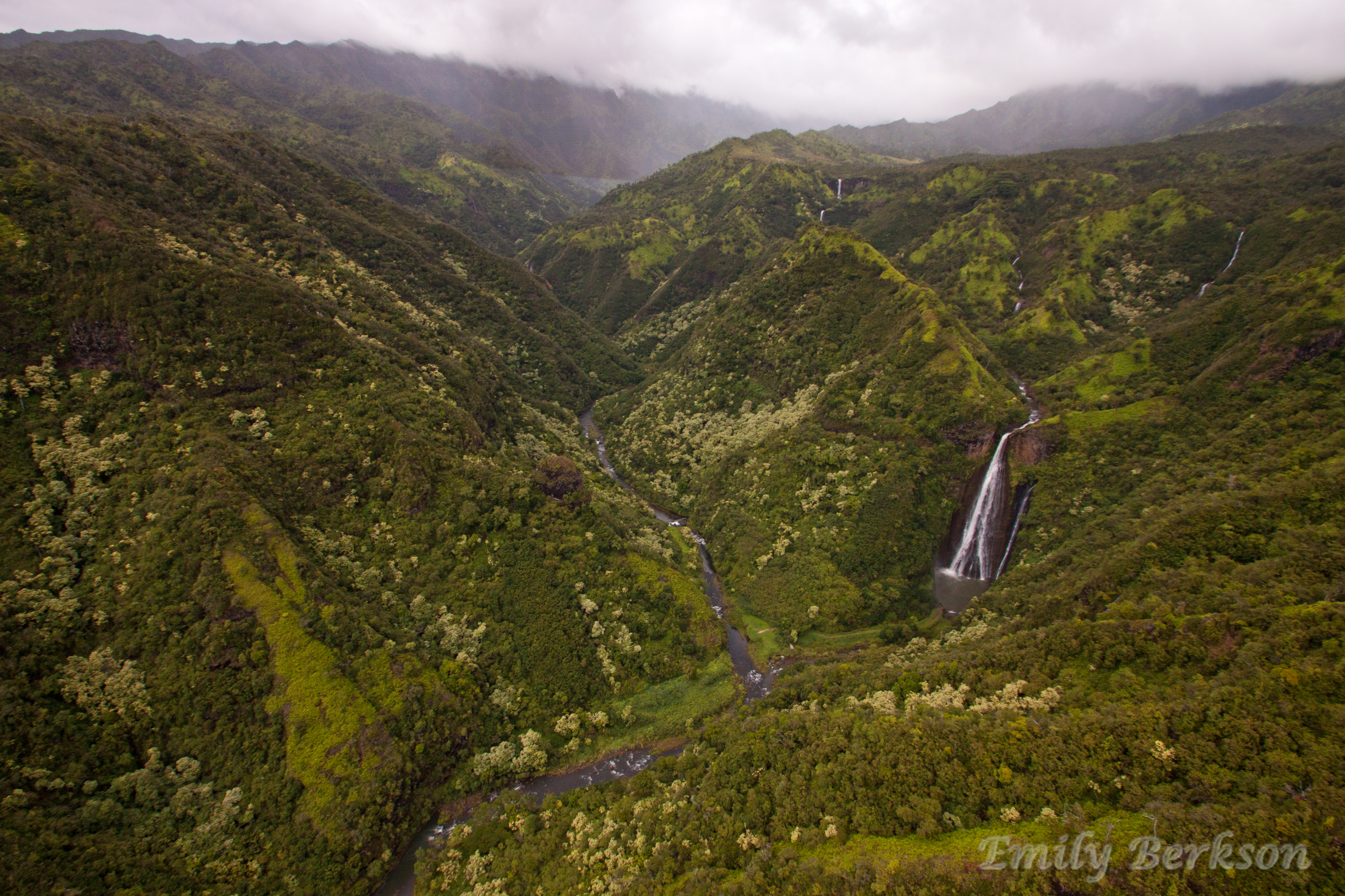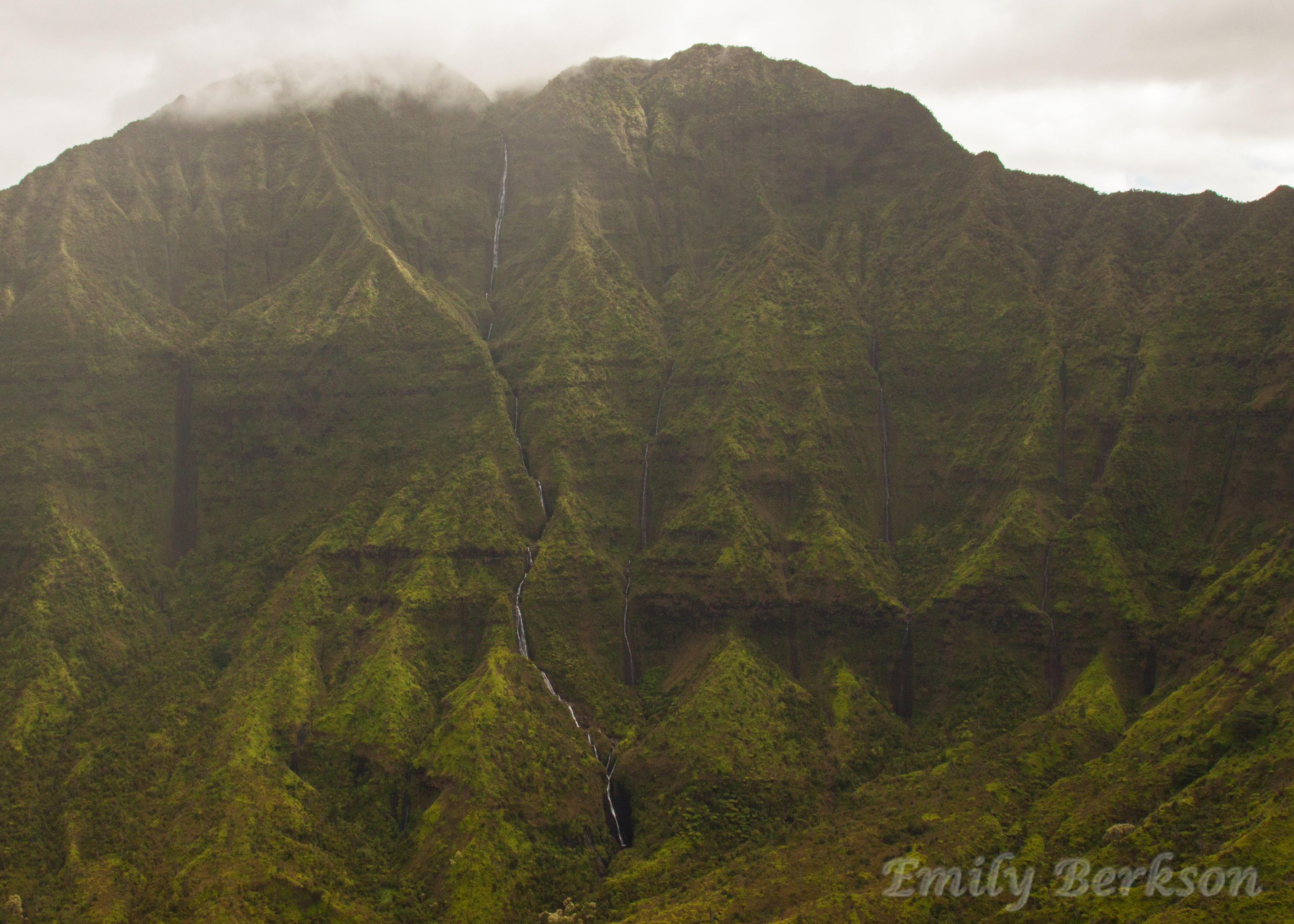 I did not want our time on the helicopter to end, but eventually we had to return to civilization. We caught a quick glimpse of Hanalei Bay before turning into one last valley to view Mt. Wai’ale’ale, one of the wettest places in the world. Everywhere the helicopter turned we were greeted with waterfalls not more than a couple feet wide, cascading thousands of feet from the cliffs. Some of the most dramatic sights made for awful pictures as we were once again swamped in clouds.