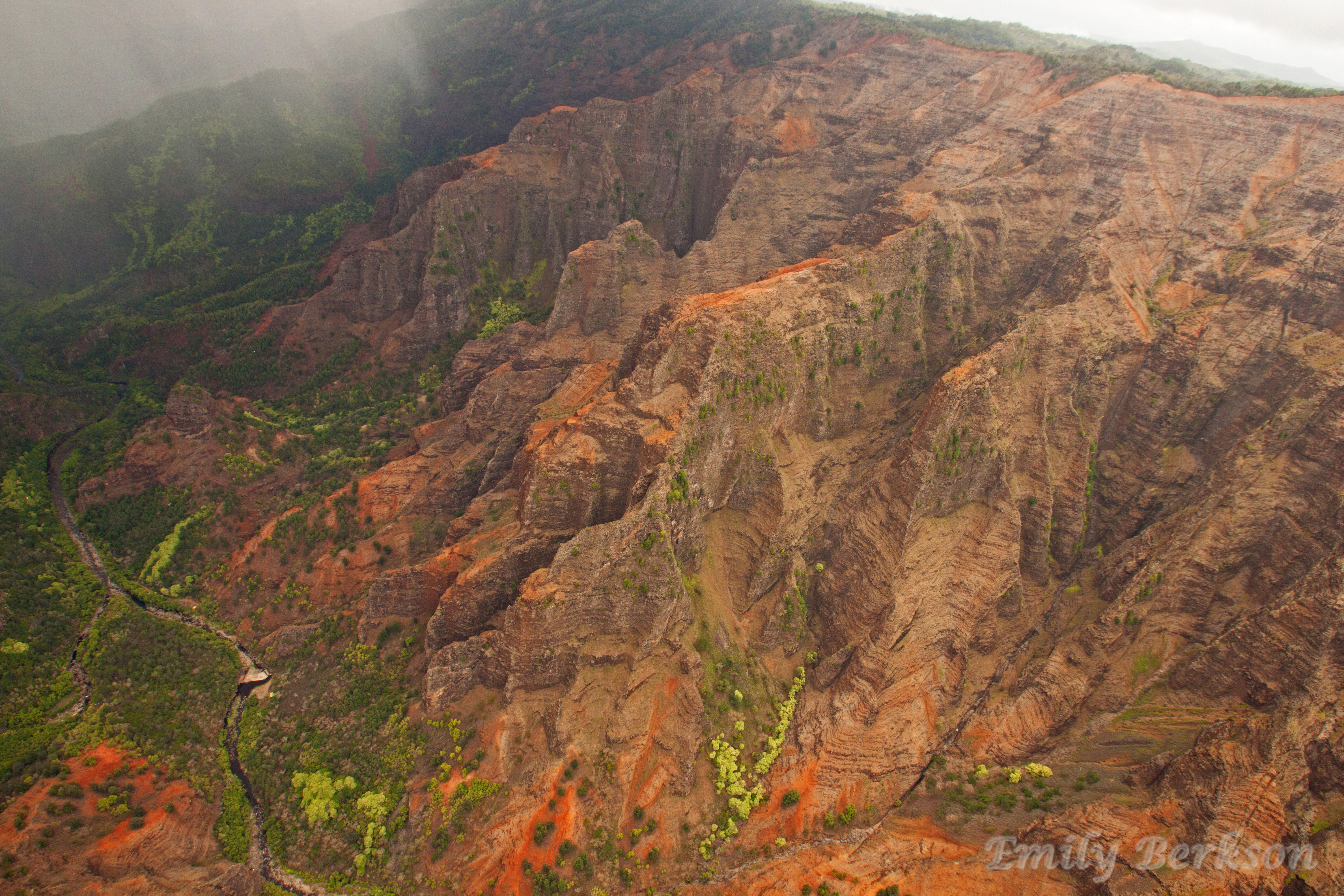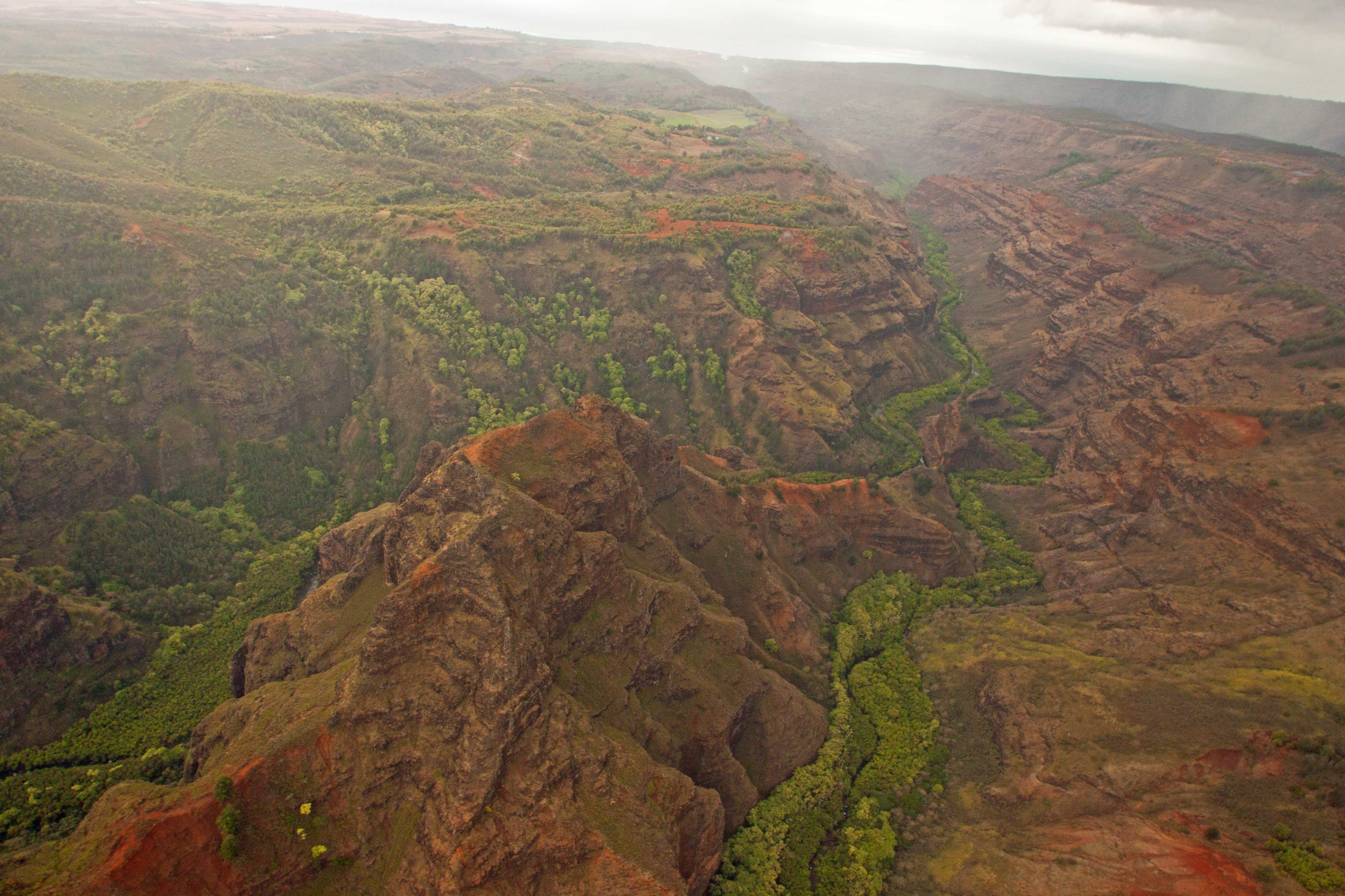After just a few minutes we were beginning our flyover of Waimea Canyon. Sadly, the cloud cover was awful at this point and we didn’t get the spectacular views we had been expecting based on the pictures. However, we planned to do some hiking in the park the next day, and we didn’t come for the canyon; we came for the coast. That just gave us a few more minutes to hope that the sky would clear up!